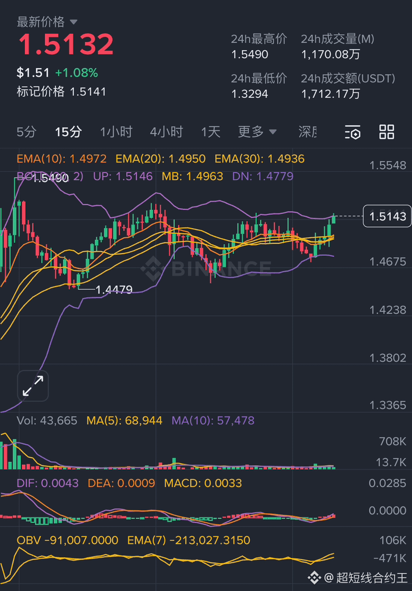 做多$M 入场:1.5050 ~ 1.5100 目标1:1.5500 目标2:1.5800 目标3:1.6100 止损:1.4950 $M 站稳EMA短期均线10/20/30。MACD红柱持续放大,DIF线在DEA线之上。 OBV指标脱离底部并向上穿越7日EMA,显示资金开始回流。 {future}(MUSDT)