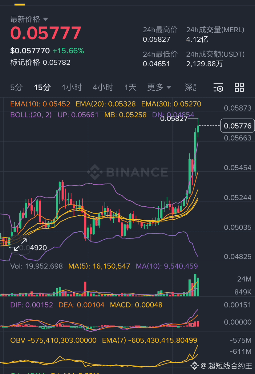 做多$MERL 入场:0.05700–0.05750 目标1:0.05900 目标2:0.06100 目标3:0.06300 止损:0.05600 $MERL EMA(10)上穿EMA(20)、EMA(30),形成多头排列,短期趋势强势。 布林带:价格突破上轨并持续运行于上轨上方,显示多头动能充足。 成交量显著放大,OBV同步向上,表明资金进场意愿较强,上涨动能有支撑。 MACD:DIF上穿DEA且红柱持续拉长,多头趋势延续性较好。 {future}(MERLUSDT)