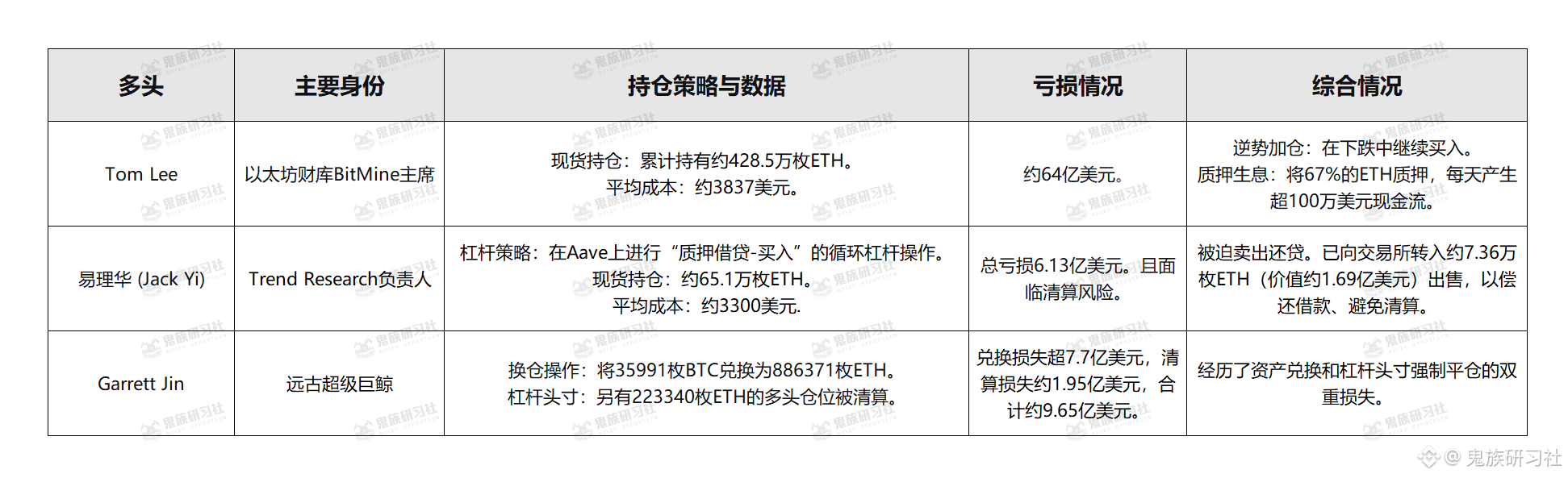 随着以太坊ETH价格快速下跌,三位公开的“巨鲸”级多头,遭受了巨额账面亏损,图片是他们亏损情况的对比。