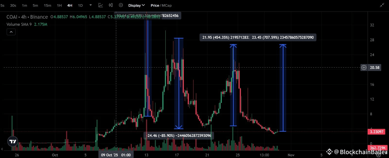 $COAI 的历史数据显示,一旦成交量放大,它往往会爆发式地突破 5-7 倍……