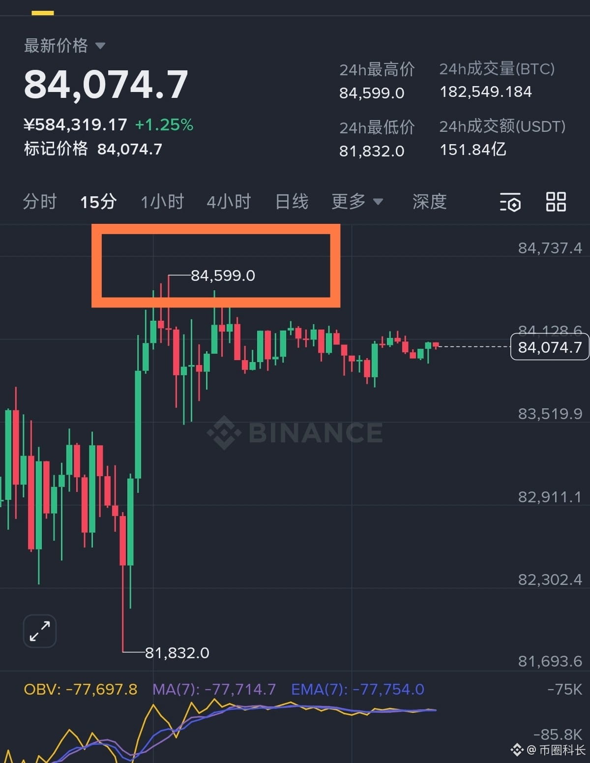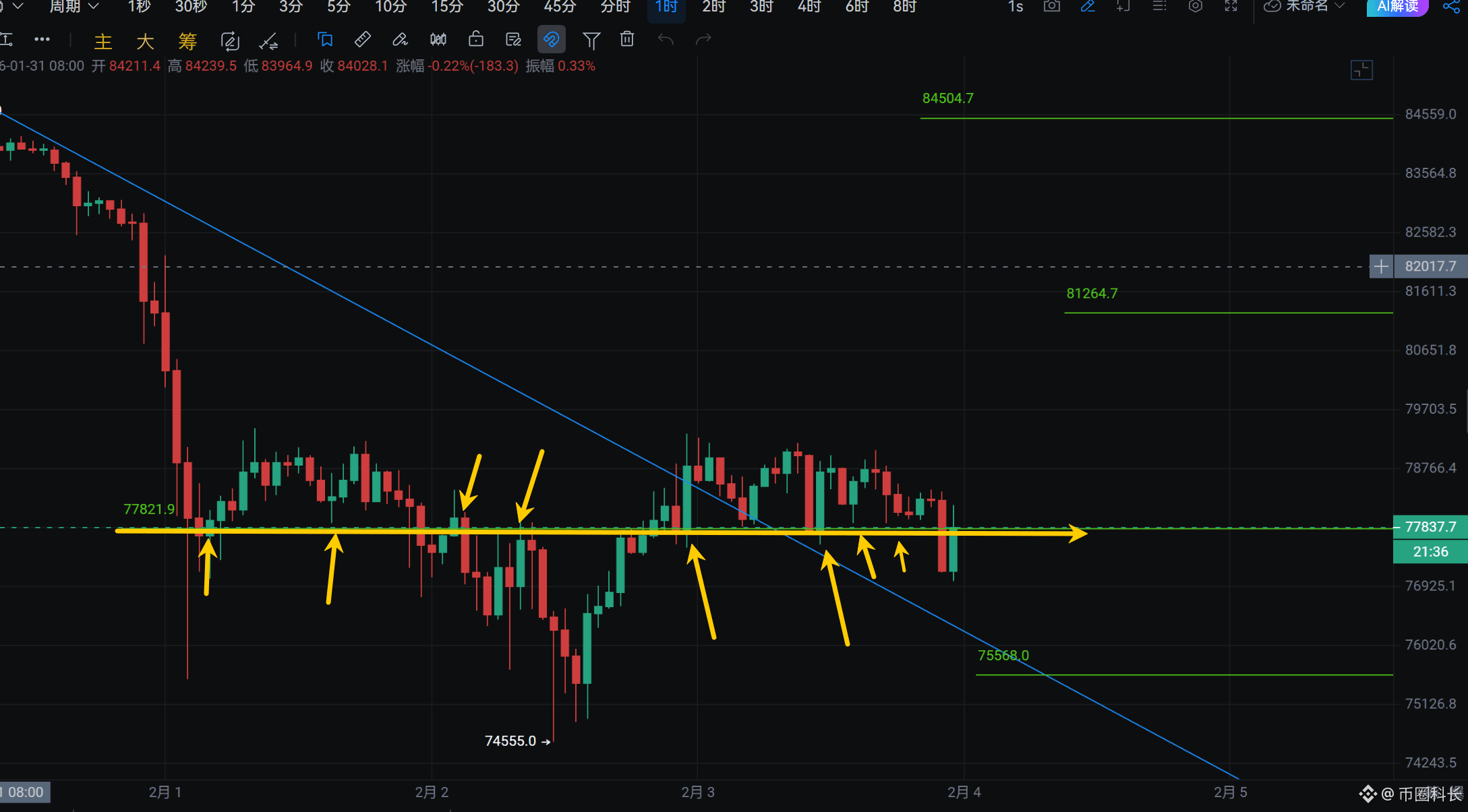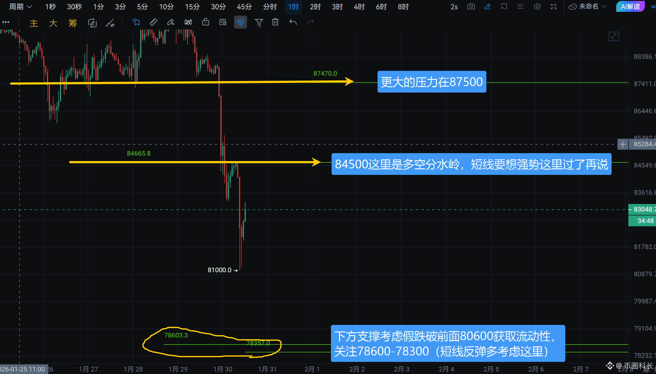 B友们早,目前广场上的分析师又进入了多空都有理的看法。 那我们就用做短线的方法去看待行情,其实是挺简单的,昨天说的这个$BTC 84600是一个短期压力,如果小时线收线突破这个位置再去做多,然后上方大压力在87500。 如果下方做多就只去接假跌破8w的针,在78600-78350之间。 只要我们不想着去格局吃大单,做短线操作吃个一两千点,然后设个保本损,不也还是美滋滋的?#美国政府停摆