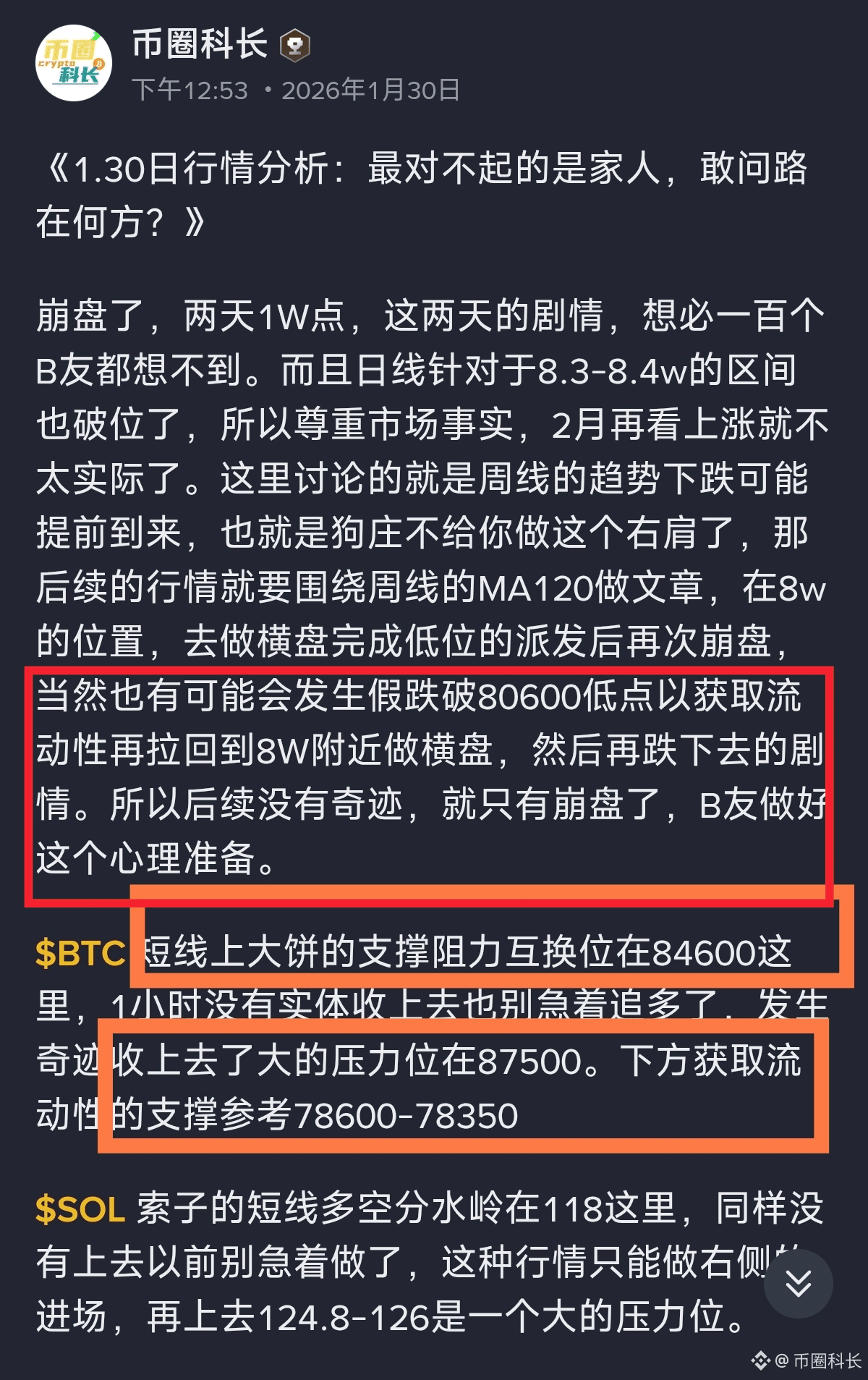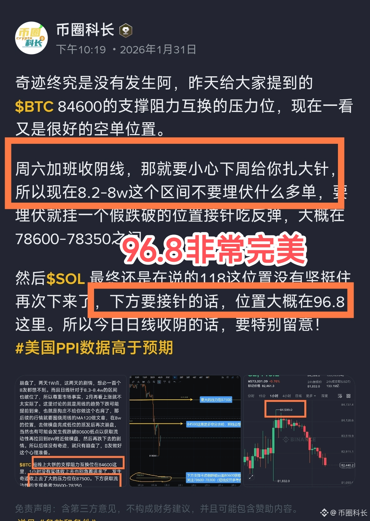 奇迹终究是没有发生阿,昨天给大家提到的$BTC 84600的支撑阻力互换的压力位,现在一看又是很好的空单位置。 周六加班收阴线,那就要小心下周给你扎大针,所以现在8.2-8w这个区间不要埋伏什么多单,要埋伏就挂一个假跌破的位置接针吃反弹,大概在78600-78350之间。 然后$SOL 最终还是在说的118这位置没有坚挺住再次下来了,下方要接针的话,位置大概在96.8这里。所以今日日线收阴的话,要特别留意!#美国PPI数据高于预期