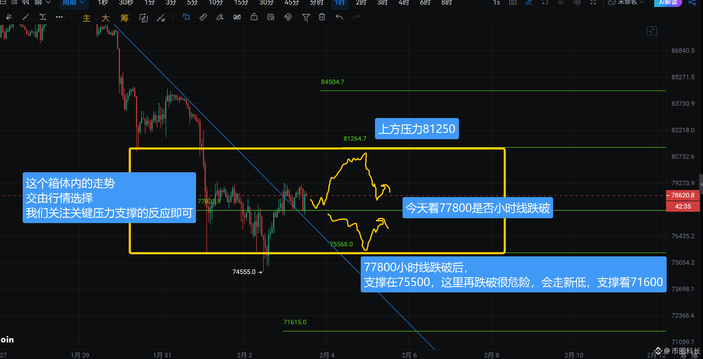 中午在$ETH 2340的位置和B友说了可以尝试做空,晚上也到了止盈位2250附近了。 $BTC 的走势上,一小时上77800的分界线目前已经实体跌破,后面回不去77800上方还要小心行情的继续下行,走势见图三。 如果下方75500附近没有停住反弹的话,要继续小心大针的来临🤡B友们早点休息! #特朗普称坚定支持加密货币