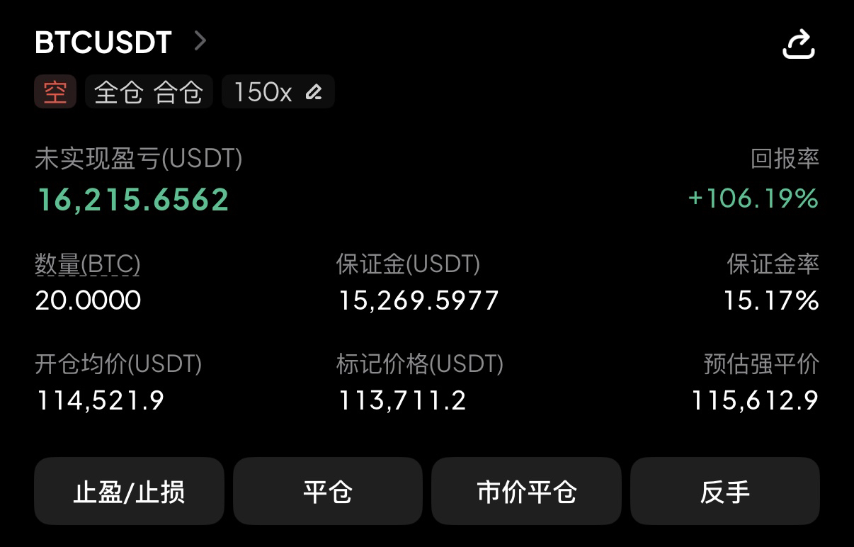 昨日给的高位空,短线看114000目标已到达,看多只能图一时利润,看空才是长久之计!