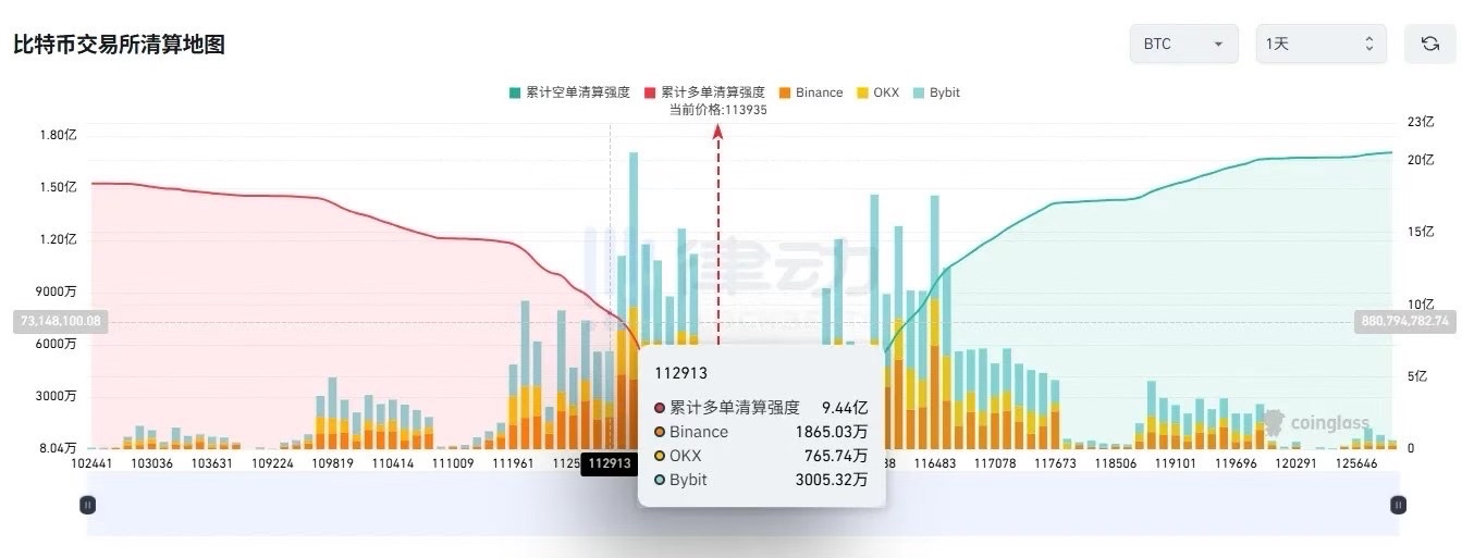 若比特币跌破 11.3 万美元,主流 CEX 累计多单清算强度将达 9.44 亿。 反之,若比特币回升至 11.5 美元上方,主流 CEX 累计空单清算强度则将达到 7728 万。