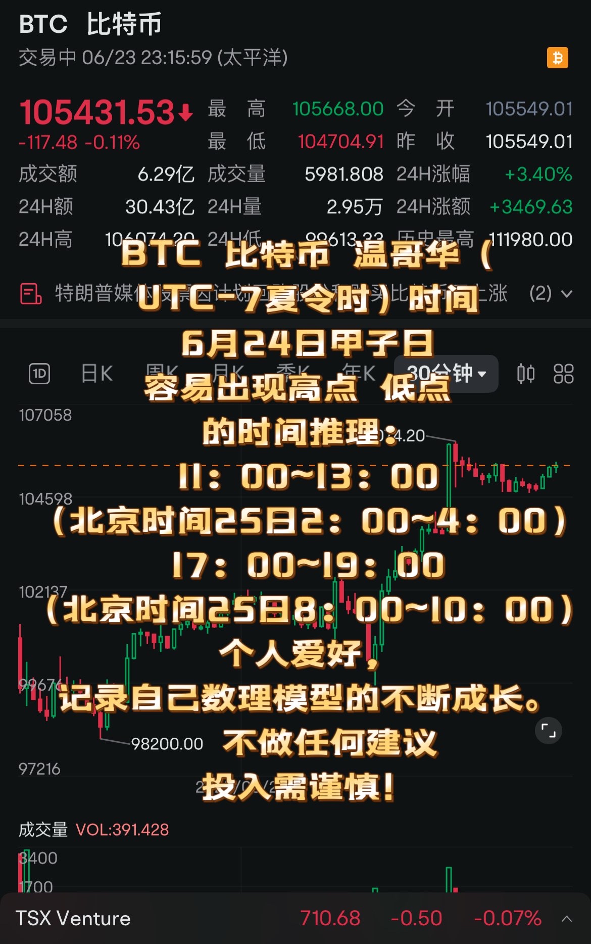 BTC 比特币 温哥华( UTC-7夏令时)时间 6月24日甲子日 容易出现高点 低点 的时间推理: 11:00~13:00 (北京时间25日2:00~4:00) 17:00~19:00 (北京时间25日8:00~10:00) 个人爱好, 记录自己数理模型的不断成长。 不做任何建议 投入需谨慎!