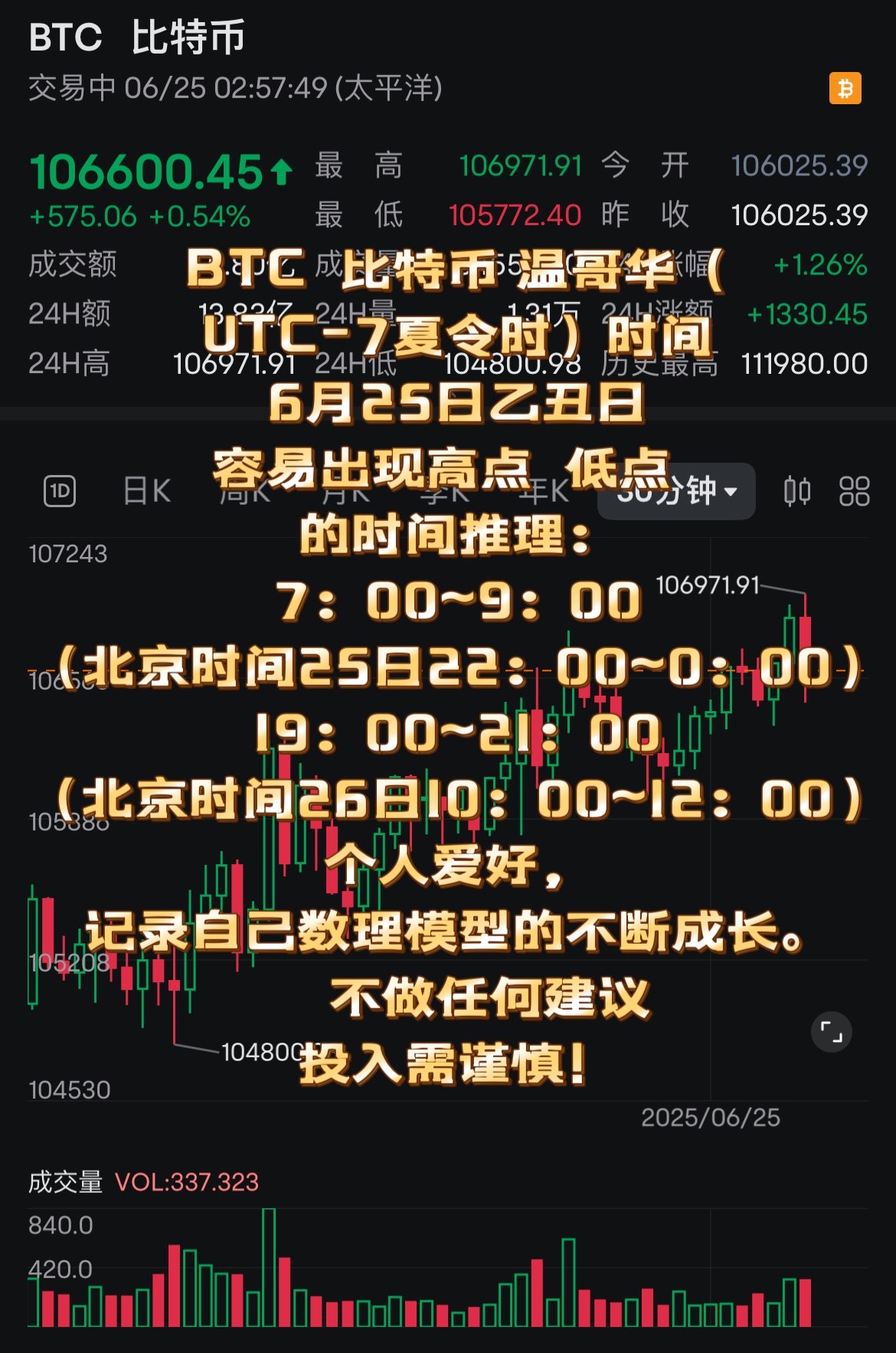 BTC 比特币 温哥华( UTC-7夏令时)时间 6月25日乙丑日 容易出现高点 低点 的时间推理: 7:00~9:00 (北京时间25日22:00~0:00) 19:00~21:00 (北京时间26日10:00~12:00) 个人爱好, 记录自己数理模型的不断成长。 不做任何建议 投入需谨慎!