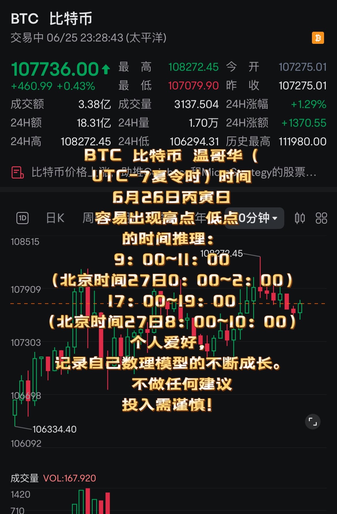 BTC 比特币 温哥华( UTC-7夏令时)时间 6月26日丙寅日 容易出现高点 低点 的时间推理: 9:00~11:00 (北京时间27日0:00~2:00) 17:00~19:00 (北京时间27日8:00~10:00) 个人爱好, 记录自己数理模型的不断成长。 不做任何建议 投入需谨慎!