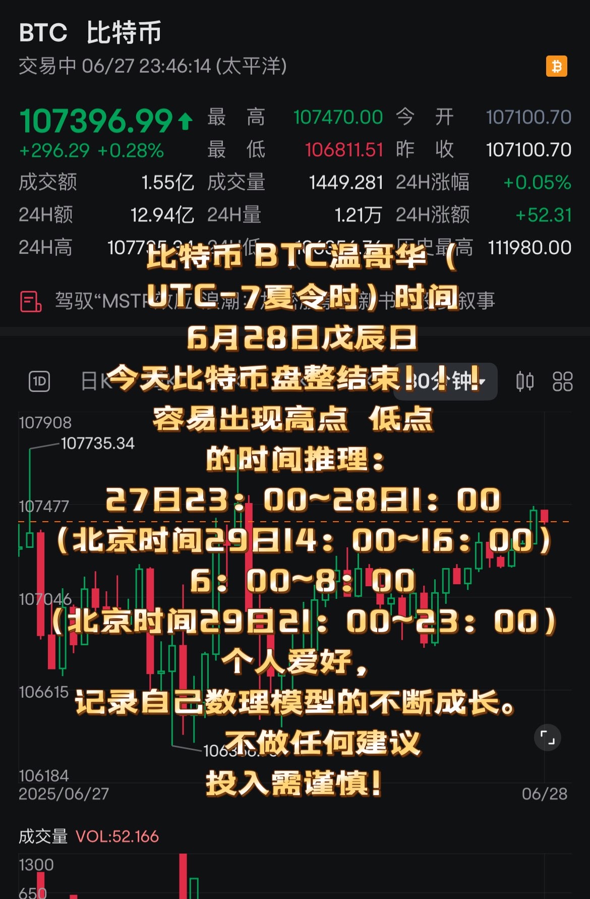 比特币 BTC温哥华( UTC-7夏令时)时间 6月28日戊辰日 今天比特币盘整结束!!! 容易出现高点 低点 的时间推理: 27日23:00~28日1:00 (北京时间29日14:00~16:00) 6:00~8:00 (北京时间29日21:00~23:00) 个人爱好, 记录自己数理模型的不断成长。 不做任何建议 投入需谨慎!