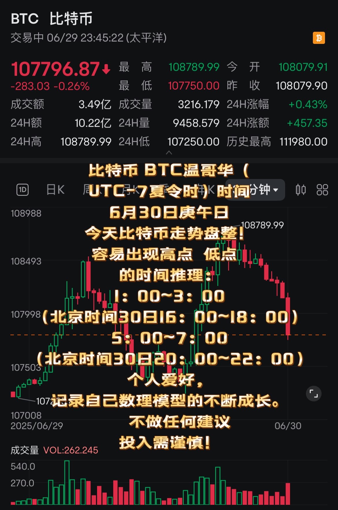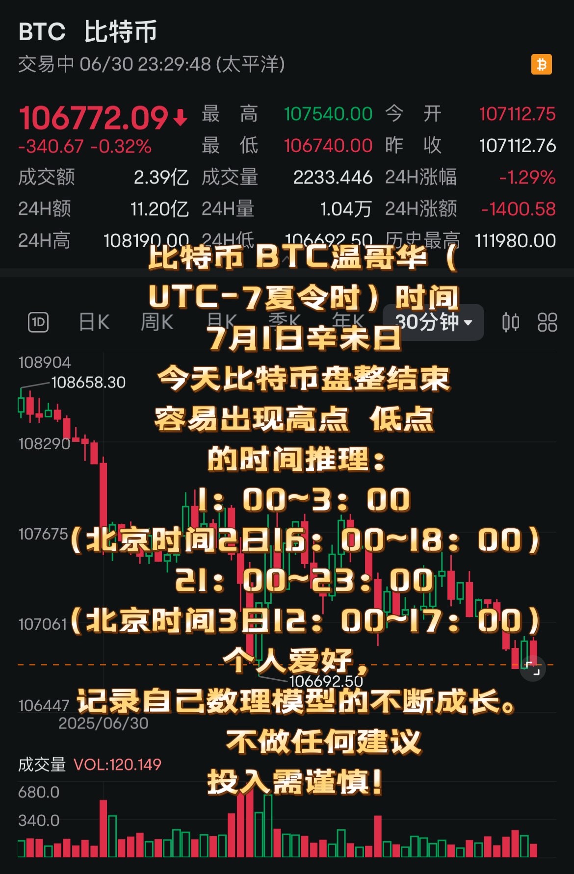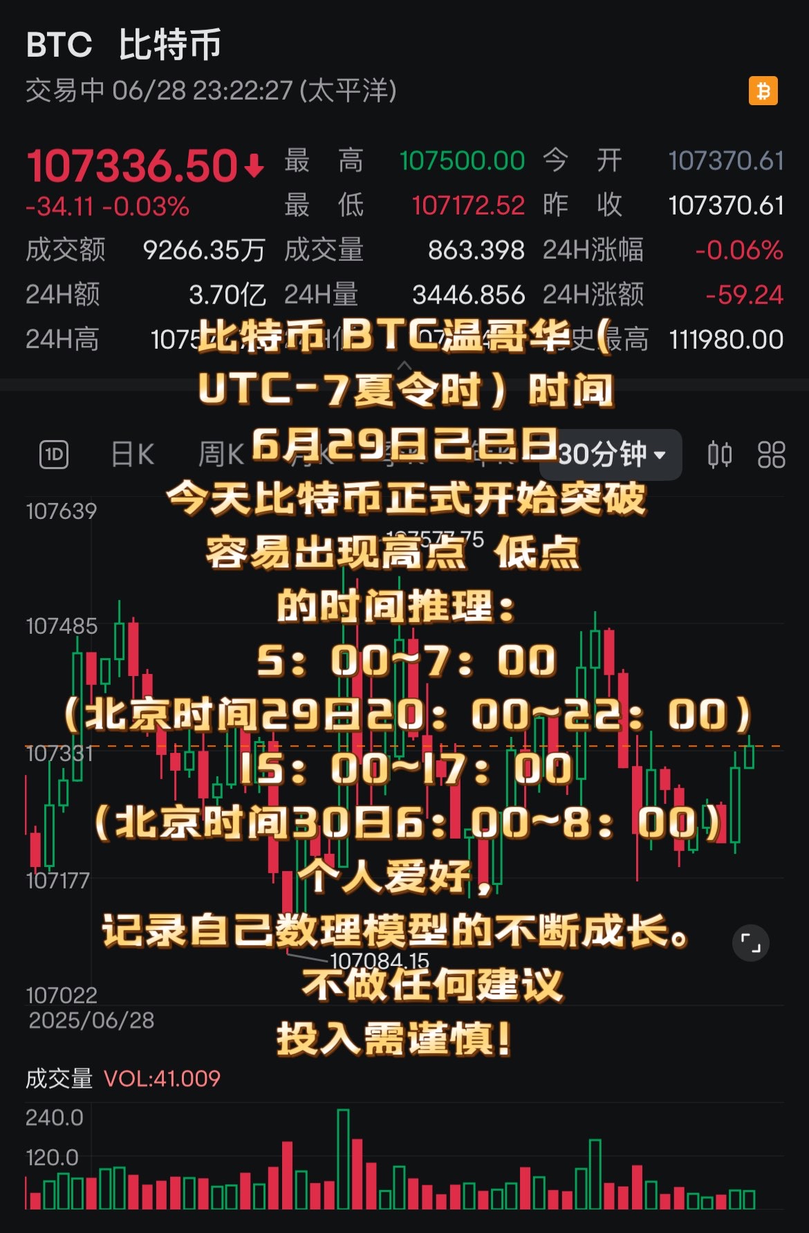 比特币 BTC温哥华( UTC-7夏令时)时间 6月29日己巳日 今天比特币正式开始突破 容易出现高点 低点 的时间推理: 5:00~7:00 (北京时间29日20:00~22:00) 15:00~17:00 (北京时间30日6:00~8:00) 个人爱好, 记录自己数理模型的不断成长。 不做任何建议 投入需谨慎!