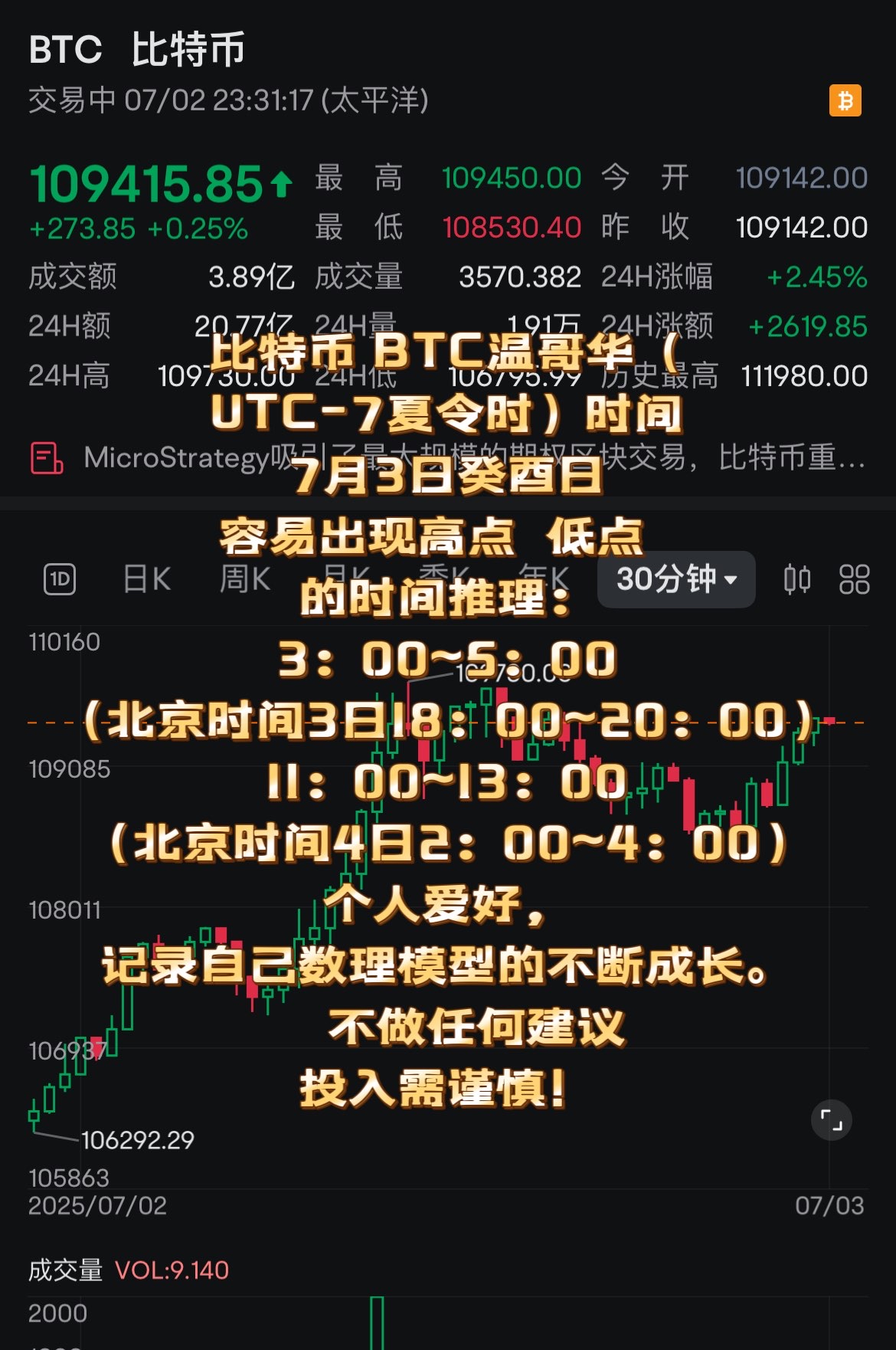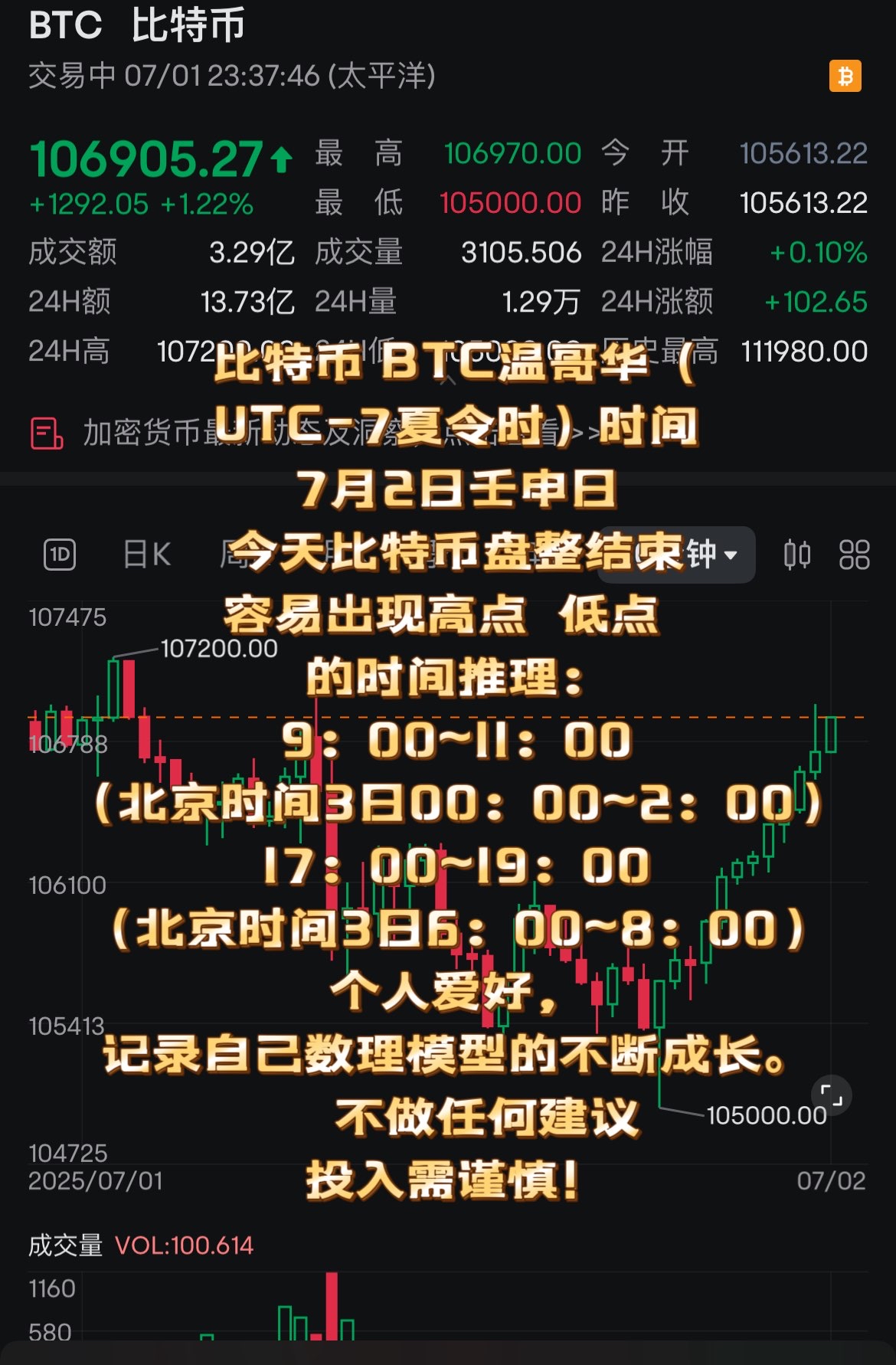 比特币 BTC温哥华( UTC-7夏令时)时间 7月3日癸酉日 容易出现高点 低点 的时间推理: 3:00~5:00 (北京时间3日18:00~20:00) 11:00~13:00 (北京时间4日2:00~4:00) 个人爱好, 记录自己数理模型的不断成长。 不做任何建议 投入需谨慎!