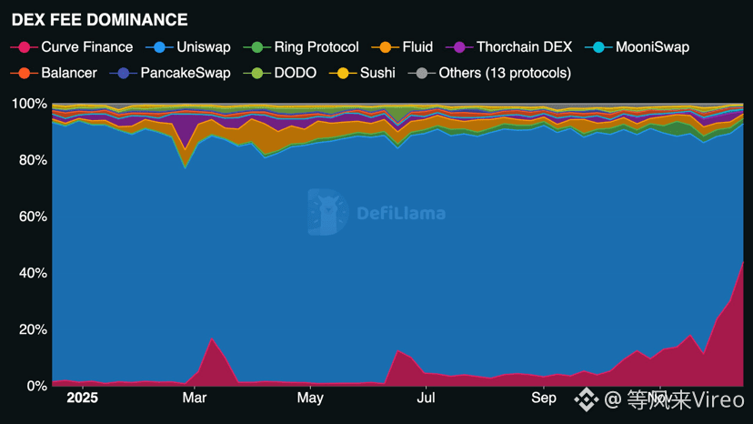 去年这个时候, @CurveFinance 贡献了 1.59%;如今,它占以太坊上所有 DEX 费用的 44.06%。 #crv $CRV