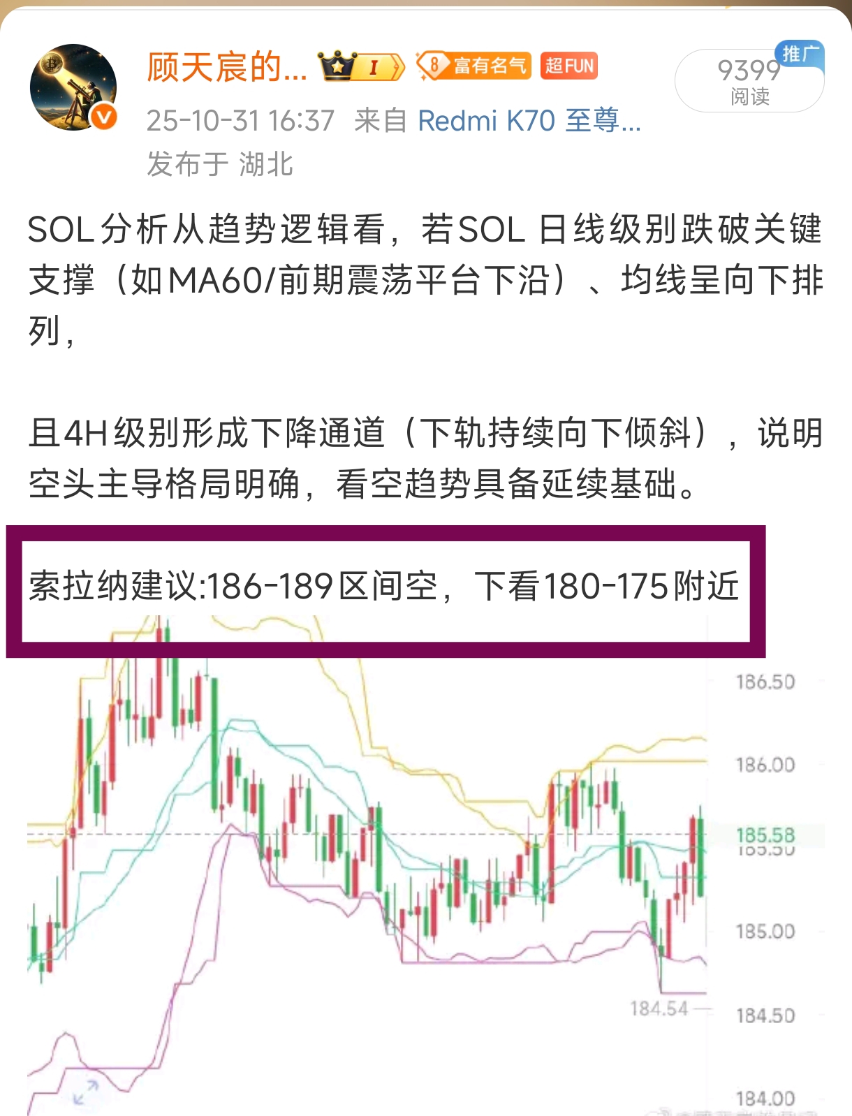 11.1sol午夜分析:从1小时K线图看,SOL在冲击190高点失败后,连续收出多根实体阴线,跌破了MA5、MA20和MA60均线。 MACD指标在高位形成死叉后,快线已下穿零轴,红色的下跌动能柱持续放量,表明市场短期趋势已发生逆转,个人建议,高位空为主,激进者184空 索拉纳稳健者建议:186-189区间空,防守193,目标下看175-170-165附近