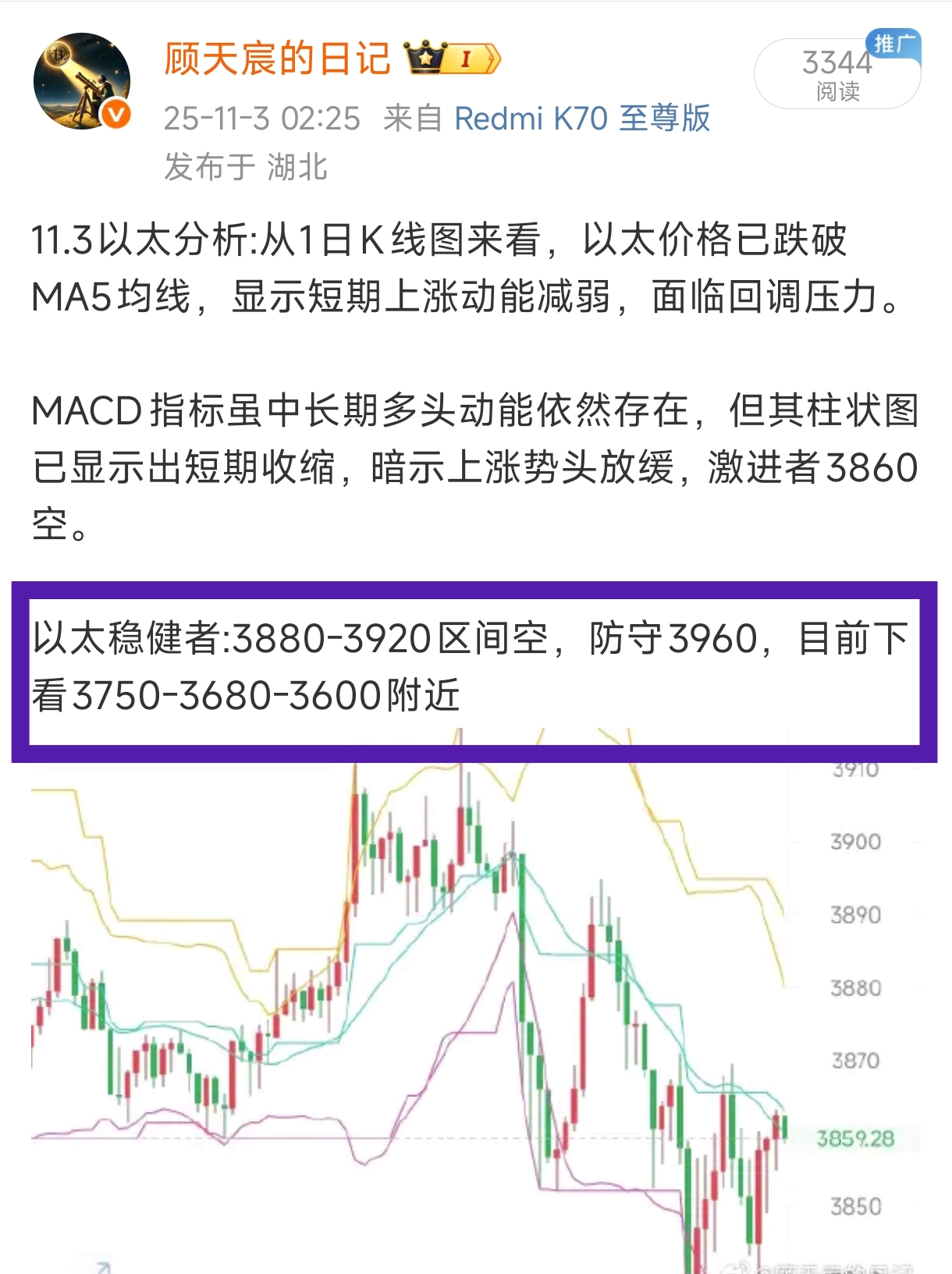 11.1以太分析:从1日K线图来看,以太价格已跌破MA5均线,显示短期上涨动能减弱,面临回调压力。 MACD指标虽中长期多头动能依然存在,但其柱状图已显示出短期收缩,暗示上涨势头放缓,激进者3860空。 以太稳健者:3880-3920区间空,防守3960,目前下看3750-3680-3600附近