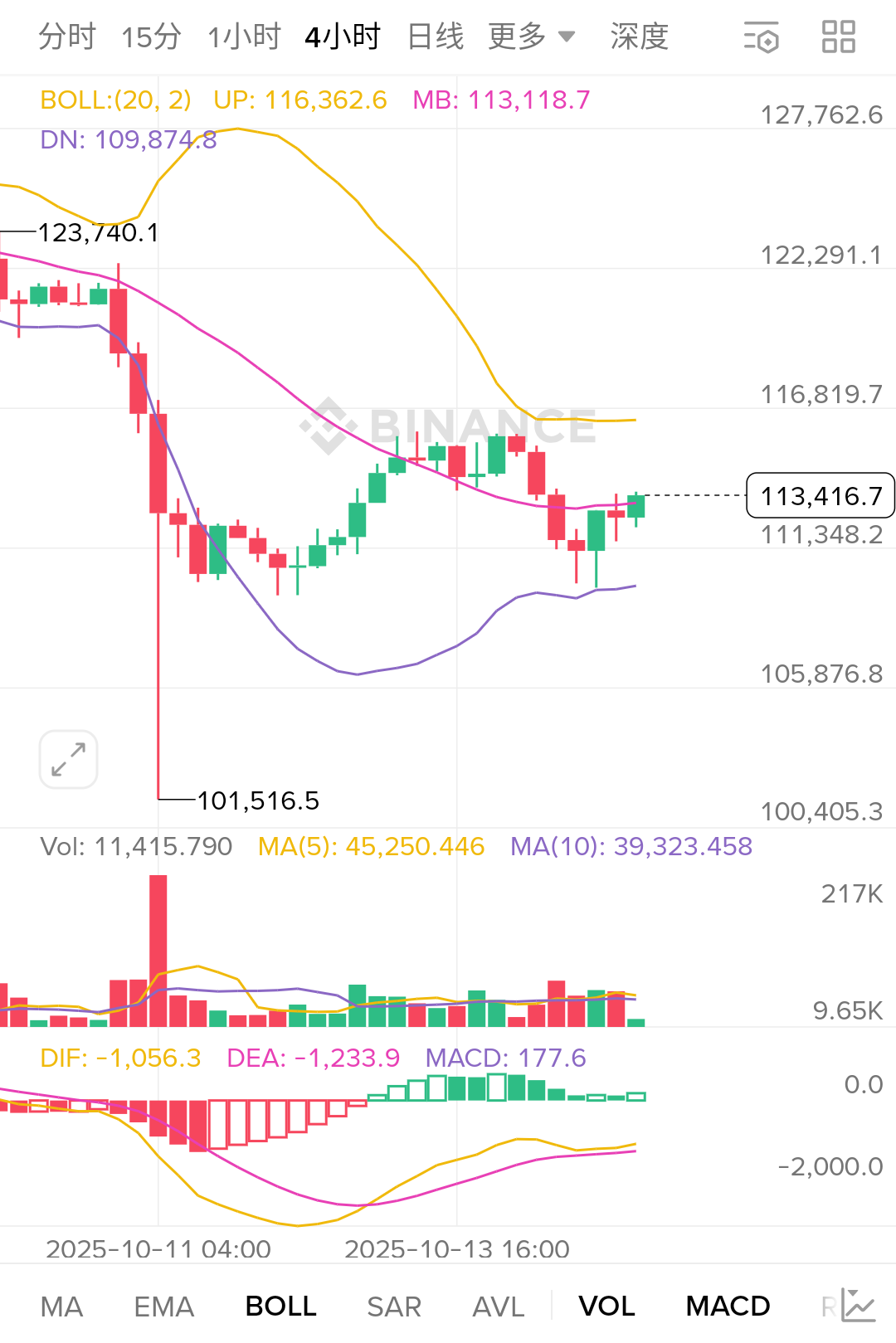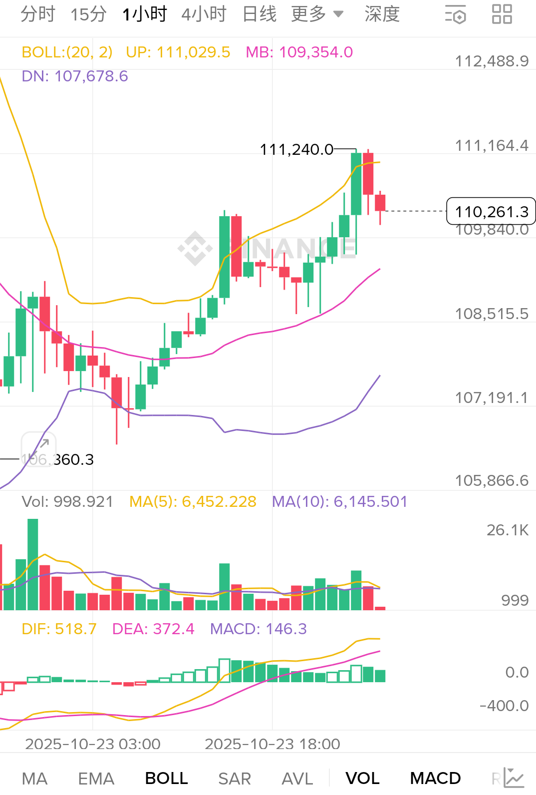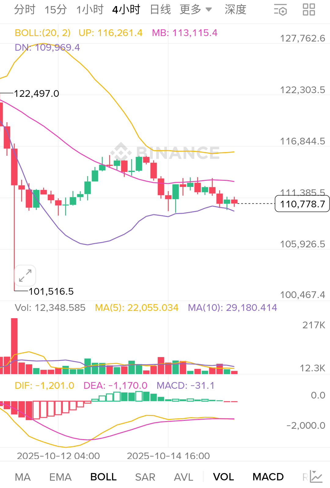 10.16凌晨分析 大饼从4小时级别分析4H线回调后于布林带中轨企稳,该价位构成短期关键支撑,空头下探动能受抑。MACD指标金叉形成并向上发散,零轴上方红柱持续放量,市场买盘主导,短线偏多格局明确。 操作建议 大饼:110600附近接哆 二饼:3960附近接哆