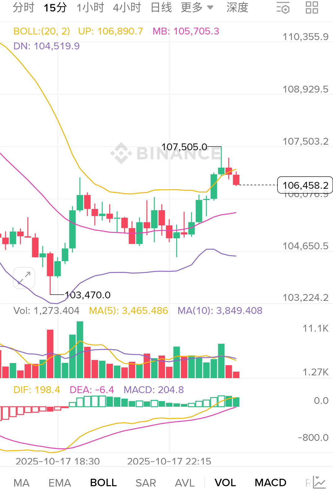 10.18凌晨分析 大饼15分钟周期下,103470关口构筑有效支撑,BBI指标实现金叉拐头,短期反弹结构确立。尽管伴随小幅资金净流出,但价格上行动能未减,且与二饼形成联动企稳格局。依托BBI均线作为多空分界,若价格持续站均线上攻,可轻仓建立多单。当前技术面筑底与市场情绪修复形成共振,日内大概率延续震荡上行。需严格设置止损点位,把握波段收益。 操作建议 大饼:回落至106400附近接哆 二饼:3780附近接哆