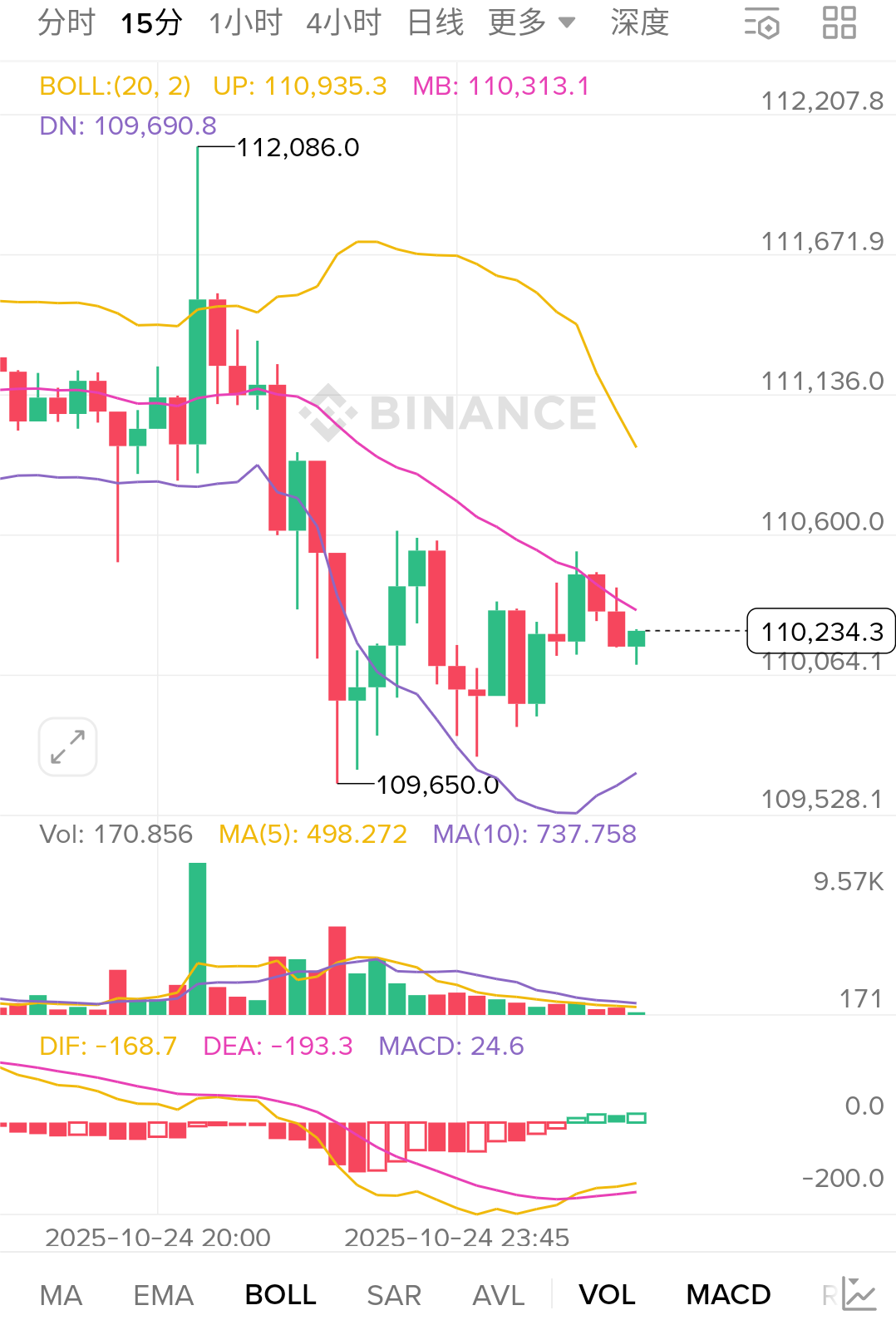 10.24凌晨分析 大饼1小时级别K线呈震荡下行态势,均线系统呈标准空头排列,价格持续受短期均线压制,上行动能匮乏。MACD指标形成死叉后,绿柱呈现持续伸长形态,空头能量释放充分;RSI指标运行于超卖区附近,虽存在短期修复预期,但未出现明确拐头信号。整体来看,当前空头主导盘面,短线大概率延续弱势整理格局。 操作建议 大饼:111000附近接箜 二饼:3880附近接箜