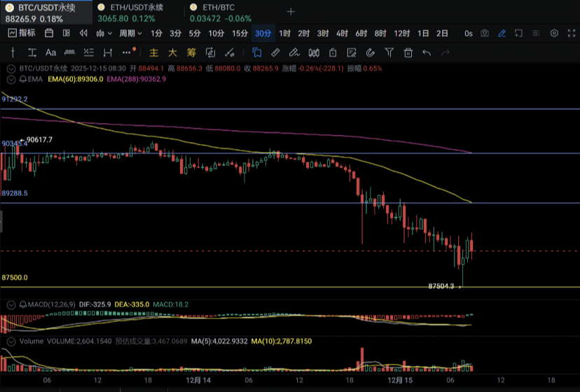 $BTC 12.17号BTC周线级别下水 2日线上涨隐形成立 观察日线级别是否死叉反抽深度 3 4小时级别底分型成立 走低金叉 15 30分钟级别水上 上方阻力88118 89109 90195 下方支撑86807 86100 85093 BTC多空比:2.01 恐慌指数:16 实盘多空比48:52 全网多空比38:62 不见形态不动手 不带止损不开单 (以上内容仅供参考 不做任何投资建议)