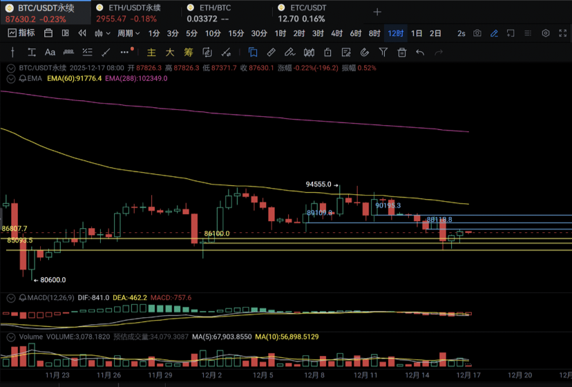 $BTC 12.18号BTC周线级别下水 日线级别死叉反抽留意下跌深度 8 12小时级别单边 4小时水下死叉 2小时级别反抽 30分钟金叉 盘面较弱 耐心等待 多看少动 上方阻力86601 87324 88118 89109 下方支撑85093 84208 83506 82588 BTC多空比:2.52 恐慌指数:22 不见形态不动手 不带止损不开单 (以上内容仅供参考 不做任何投资建议)
