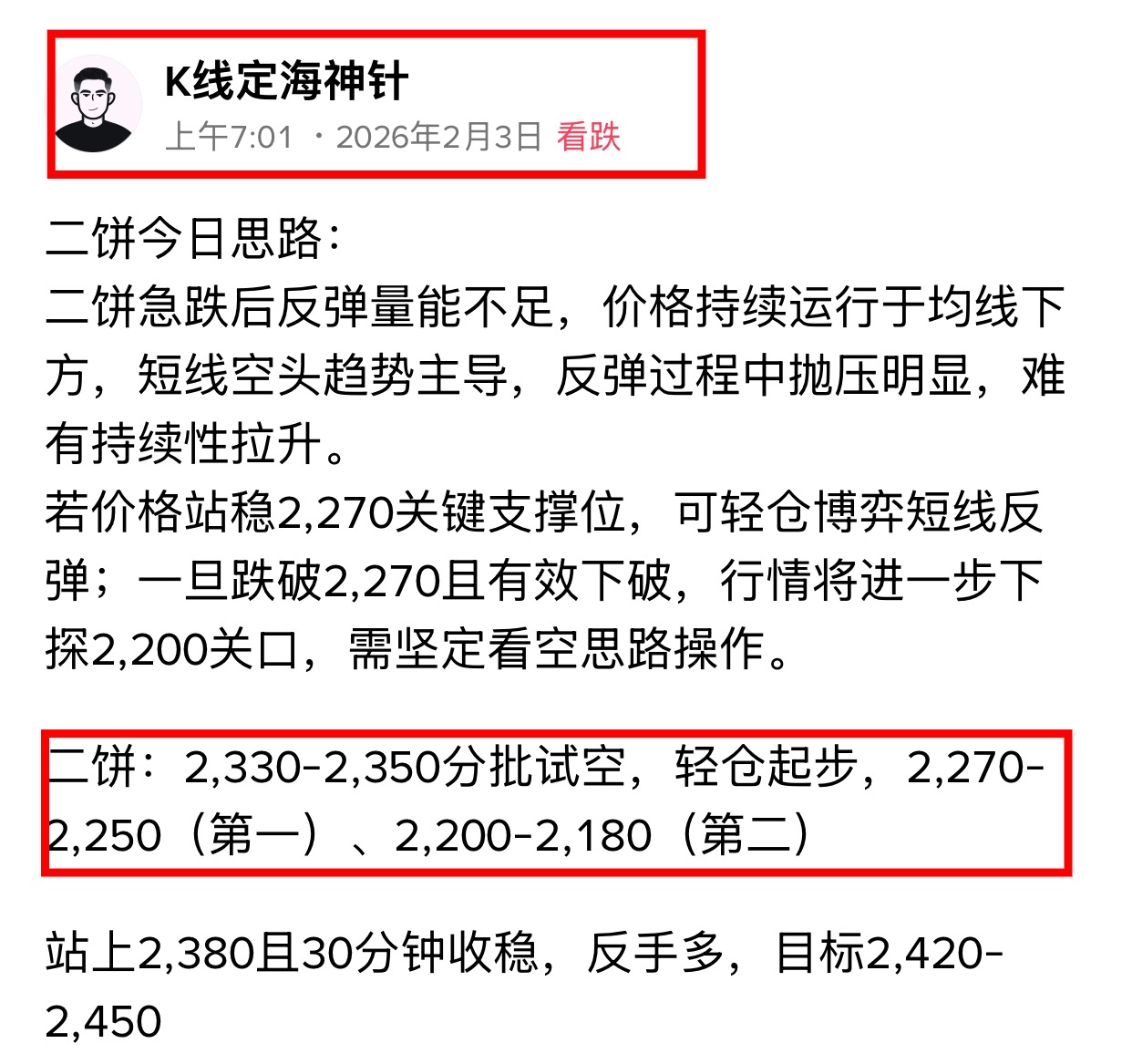 二饼今日思路: 二饼急跌后反弹量能不足,价格持续运行于均线下方,短线空头趋势主导,反弹过程中抛压明显,难有持续性拉升。 若价格站稳2,270关键支撑位,可轻仓博弈短线反弹;一旦跌破2,270且有效下破,行情将进一步下探2,200关口,需坚定看空思路操作。 二饼:2,330-2,350分批试空,轻仓起步,2,270-2,250(第一)、2,200-2,180(第二) 站上2,380且30分钟收稳,反手多,目标2,420-2,450