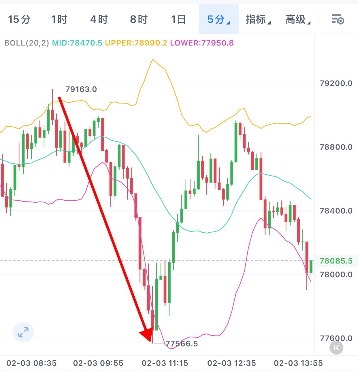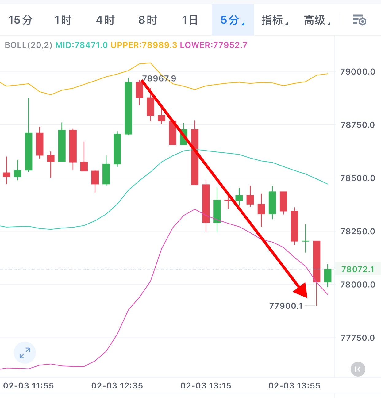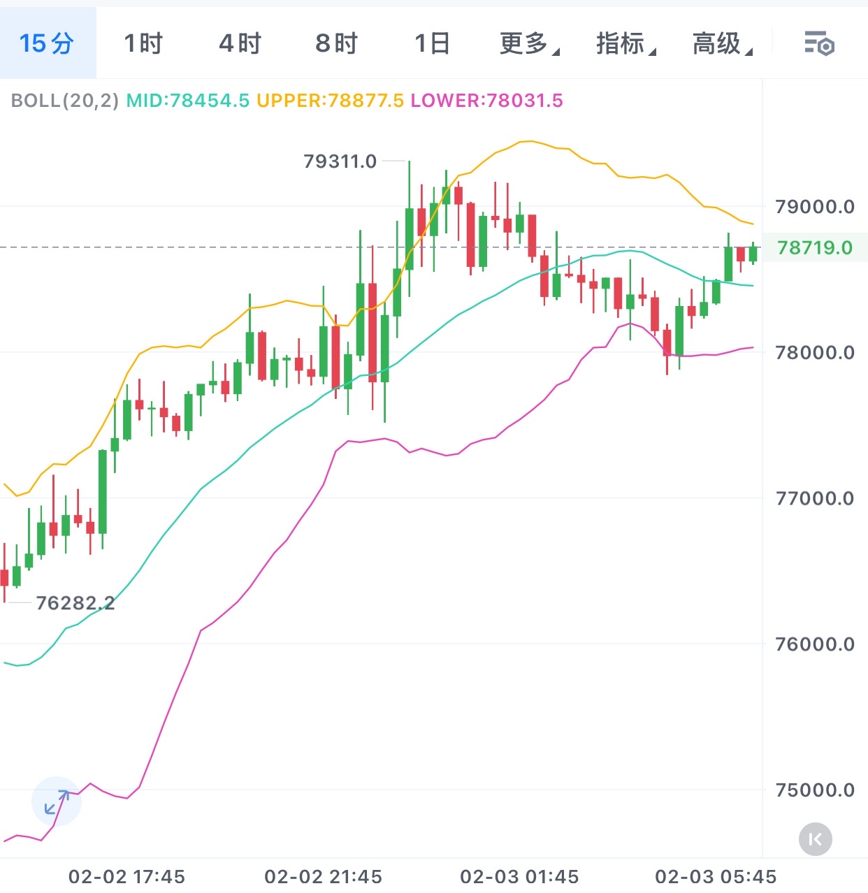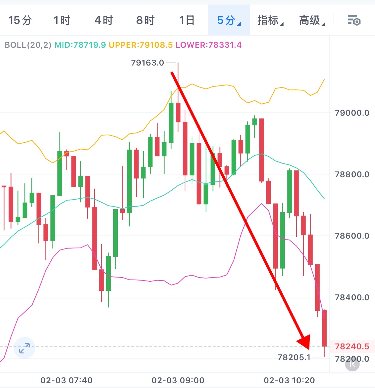 今日大饼思路: 周末急跌后反弹乏力,价格承压均线下方,空头趋势明确;市场恐慌情绪未散,反弹易遇抛压;美联储鹰派预期升温、多国加密监管收紧,双重压制下资金与机构态度谨慎,风险资产走弱成大概率。 大饼:79300-79500进,目标76700-77500