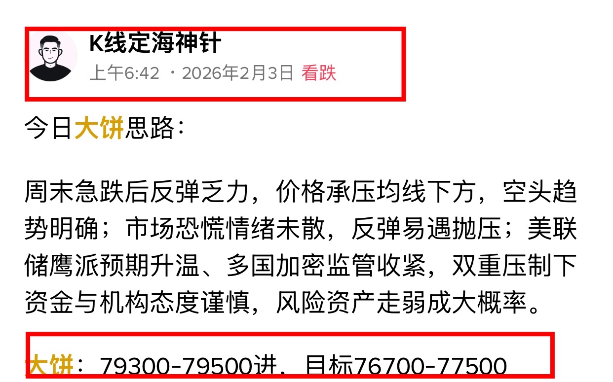实时同步:大饼、二饼精准验证 大饼: 早间思路里给到的 79300-79500 空单区间,价格最高触及 79163 后精准回落,当前已到 78240,第一目标已提前兑现,空头趋势完全符合预期。 二饼: 给出的 2330-2350 分批试空区间,价格反弹承压后下行,目前正朝着 2270-2250 的第一目标位迈进,节奏完美契合预判。