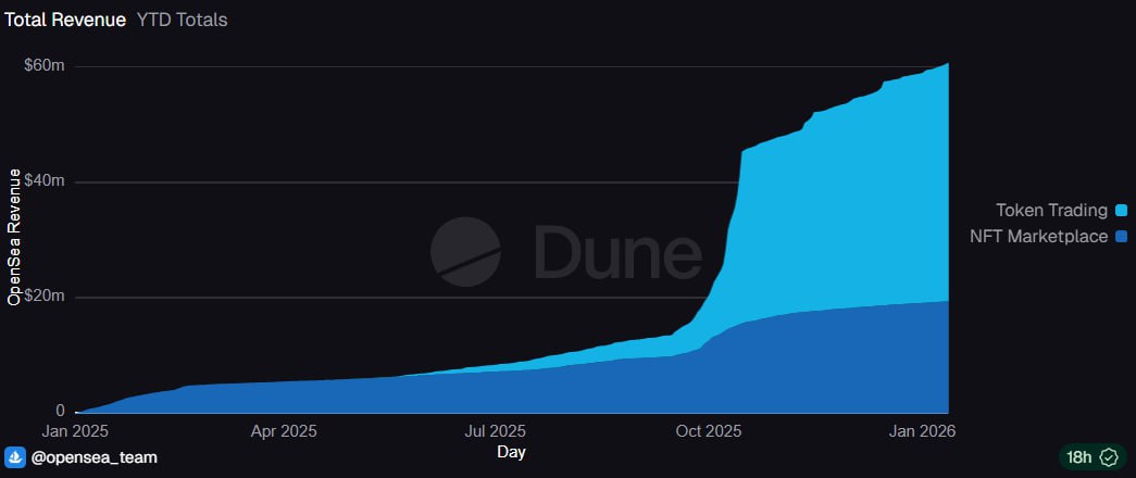 吴说获悉,据 OpenSea 团队面板,自 2025 年 1 月以来,OpenSea 已捕获了超过 6,000 万美元收入,其中从 NFT 市场捕获了近 1,950 万美元收入,从代币交易中捕获了超过 4,100 万美元收入。与此同时,自 2025 年 1 月以来,OpenSea 完成了近 50 亿美元的代币交易量,而 NFT 交易量约为 22 亿美元。