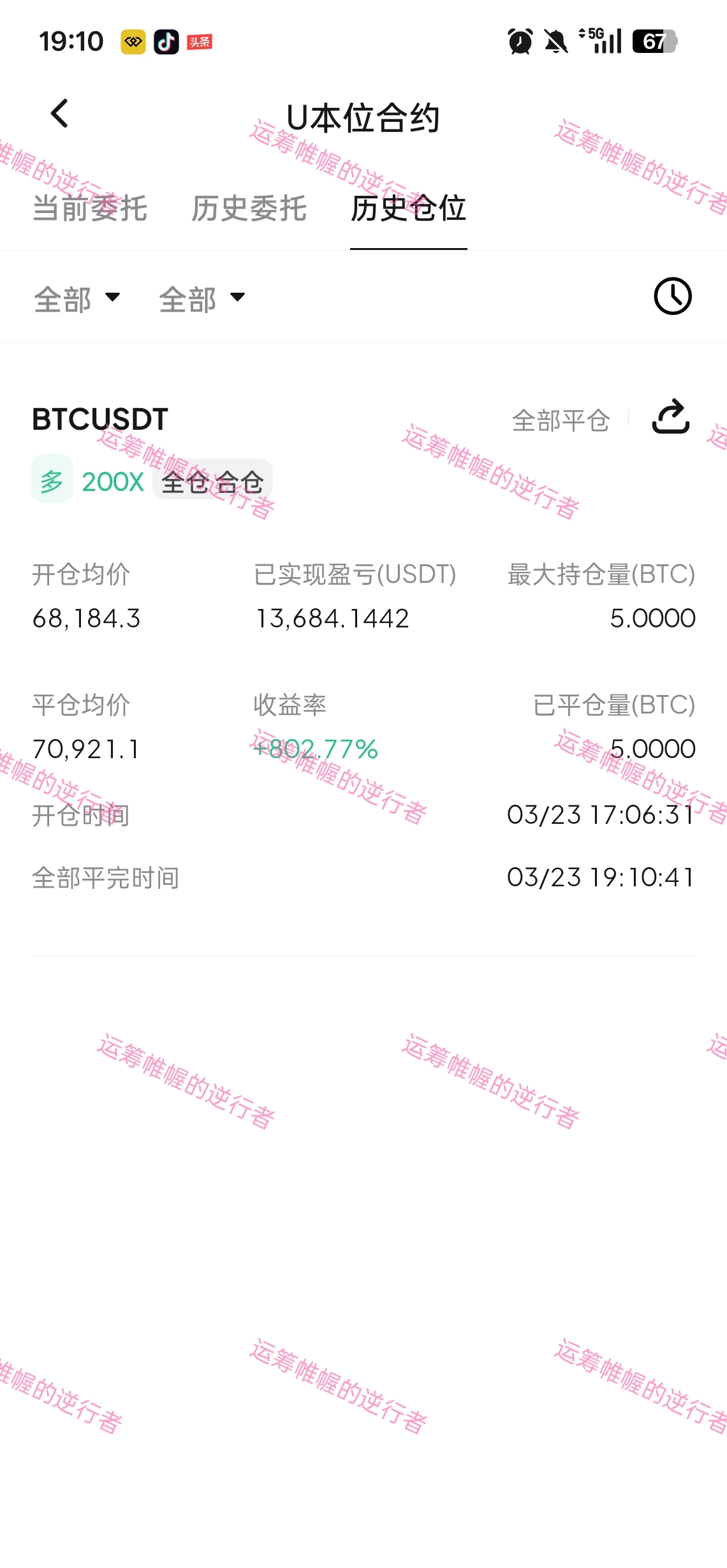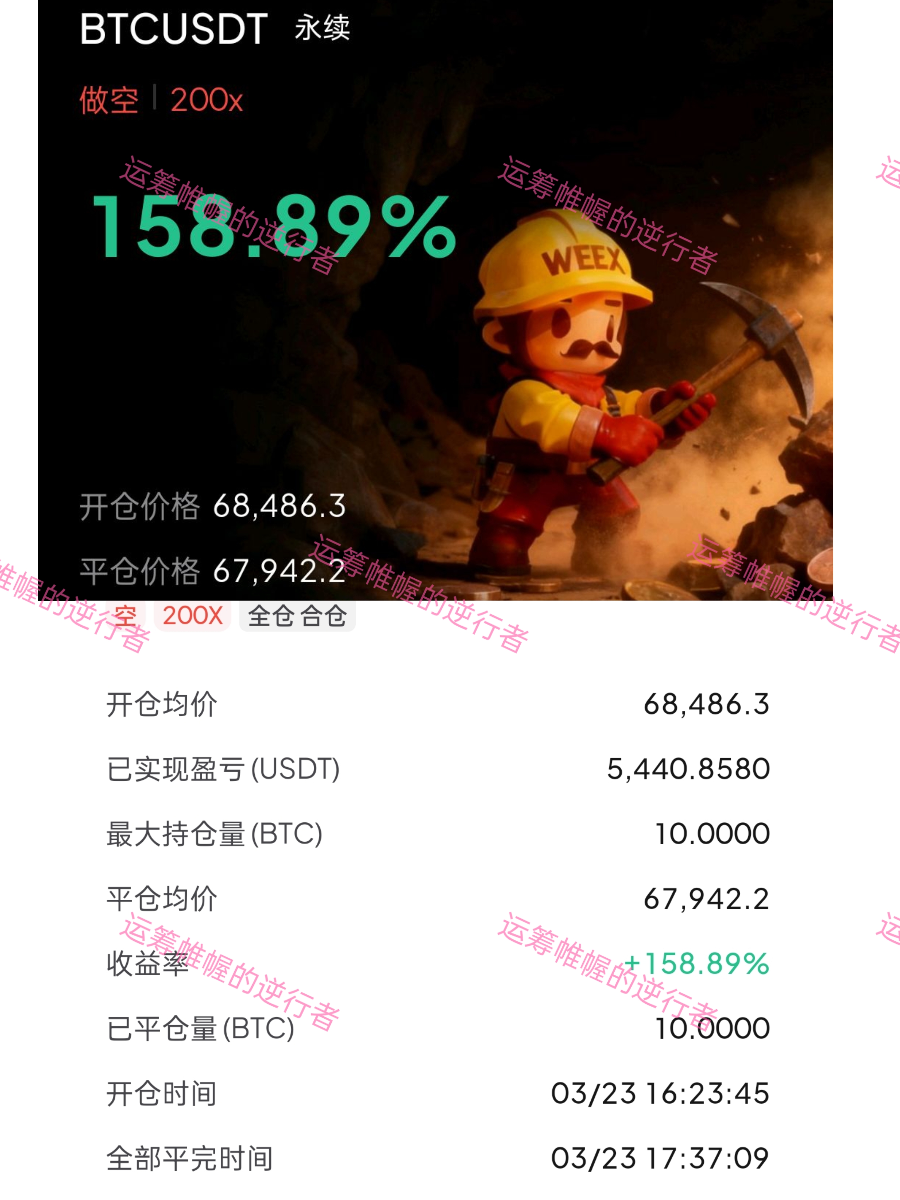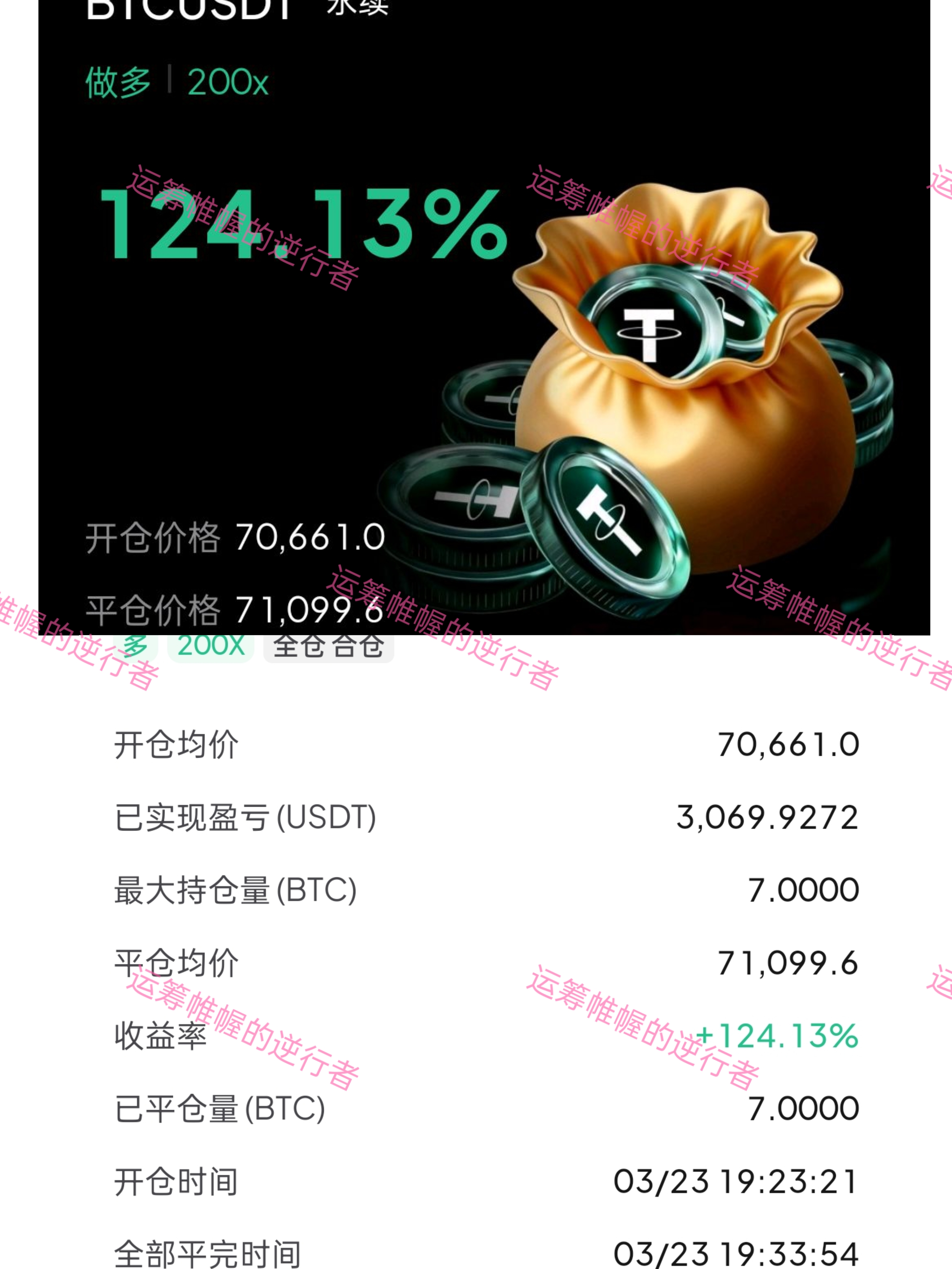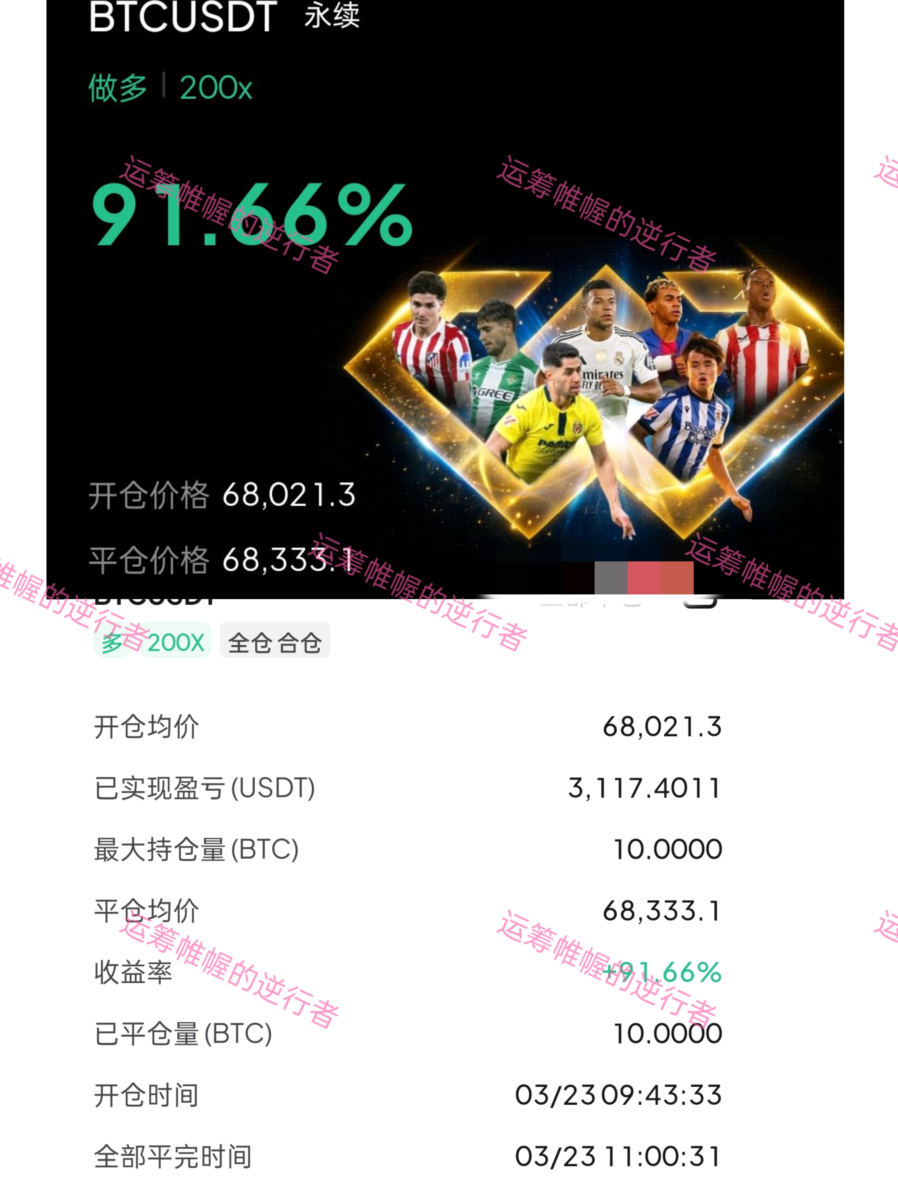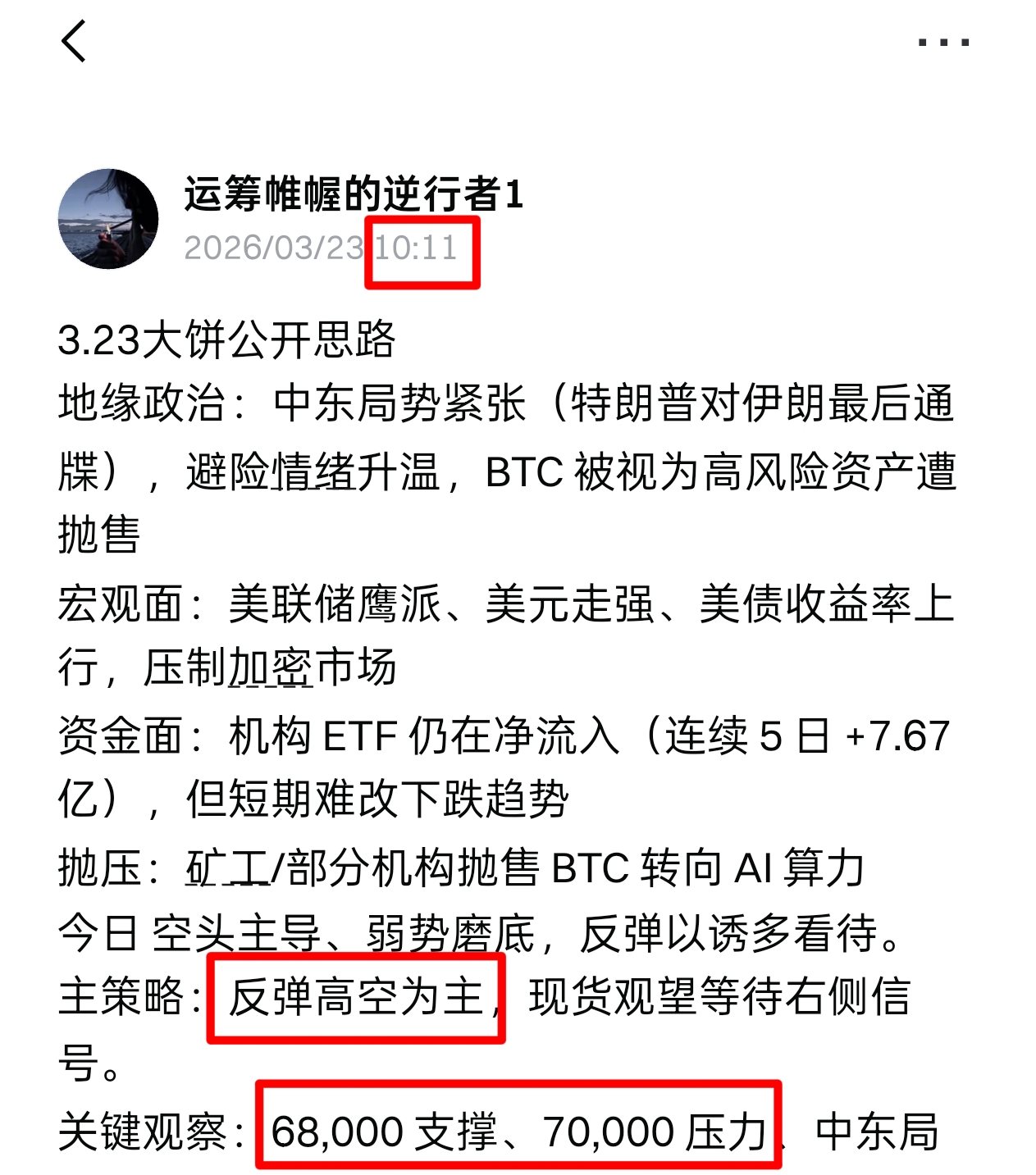 3.23大饼公开思路 地缘政治:中东局势紧张(特朗普对伊朗最后通牒),避险情绪升温,BTC 被视为高风险资产遭 资金面:机构 ETF 仍在净流入(连续 5 日 +7.67 亿),但短期难改下跌趋势 抛压:矿工/部分机构抛售 BTC 转向 AI 算力 今日 空头主导、弱势磨底,反弹以诱多看待。 主策略:反弹高空为主,现货观望等待右侧信号。 关键观察:68,000 支撑、70,000 压力、中东局势与晚间宏观数据。