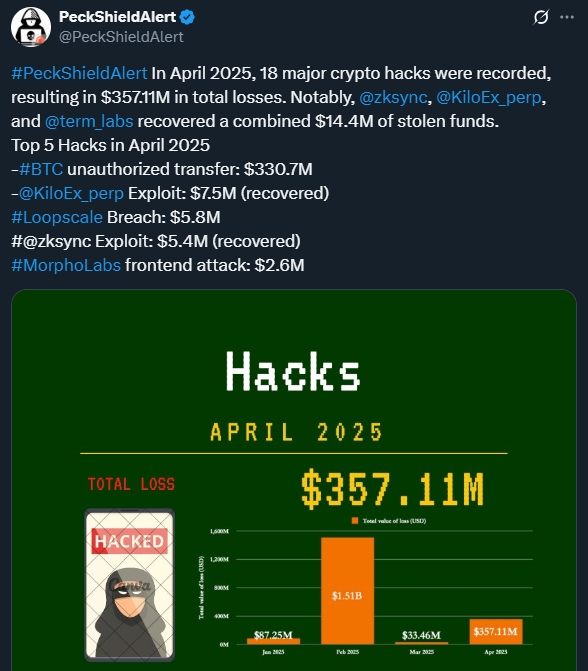 In April 2025, the cryptocurrency industry faced a severe security crisis. Blockchain security firm PeckShieldAlert reported a total of 18 major hacking incidents during the month, resulting in losses amounting to $357.11 million.