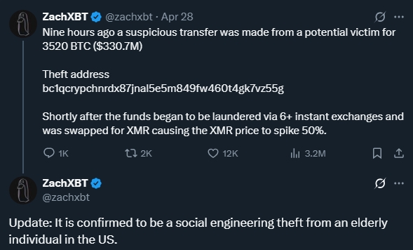 l Incident Details: An elderly U.S. citizen lost $352.07 million in Bitcoin due to a social engineering attack, marking it the fifth-largest cryptocurrency hack in history. The attacker gained access to the victim’s wallet private keys through a carefully orchestrated scheme, subsequently laundering the funds via instant exchanges and converting them to Monero, making recovery extremely challenging.