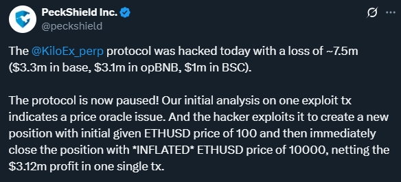l Incident Details: Decentralized perpetual futures exchange KiloEx suffered a $7.5 million loss across the Base, opBNB, and BSC chains due to a price oracle manipulation attack. The attacker drained liquidity pools by manipulating token prices, but the project team successfully recovered all funds through negotiations with the hacker, paying a 10% bounty.