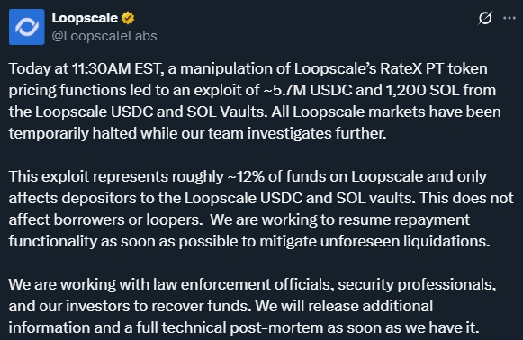 l Incident Details: Solana-based DeFi lending protocol Loopscale, only weeks after its launch, was attacked, resulting in a $5.8 million loss. The hacker exploited a low-collateral loan vulnerability, draining USDC and SOL liquidity pools and causing a temporary market suspension. Recovery efforts are ongoing.