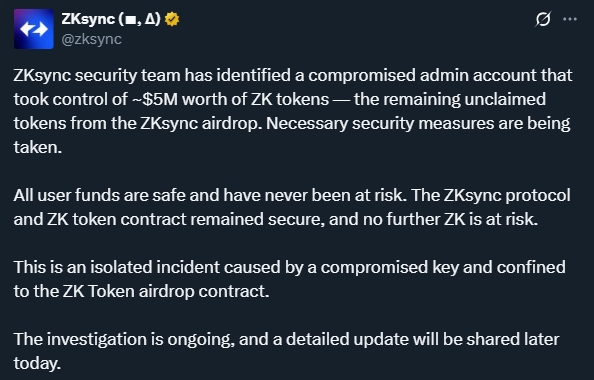 l Incident Details: Ethereum Layer-2 protocol ZKsync suffered a $5.4 million unauthorized ZK token minting attack due to a compromised admin account. The attacker exploited the sweepUnclaimed() function to drain airdrop reserves, but through negotiations, the protocol recovered the funds, paying a 10% bounty.